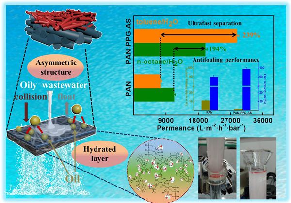 为进一步提升膜的渗透性能,研究团队利用静电纺丝技术设计了具有不对称结构的超亲水凝胶网络改性聚丙烯腈纳米纤维膜。据报道,该种非对称纳米纤维膜对正辛烷和甲苯乳液的渗透通量分别高达22206 L·m-2·h-1·bar-1和29840 L·m-2·h-1·bar-1,可以有效去除乳液中粒径68nm以上的油滴(99.2%),通量恢复率高达98.8±1%,不可逆污染率仅占1.6±1%,在含油废水处理领域具有广阔的应用前景,相关研究成果发表在材料科学领域顶级期刊Journal of Materials Chemistry A上。