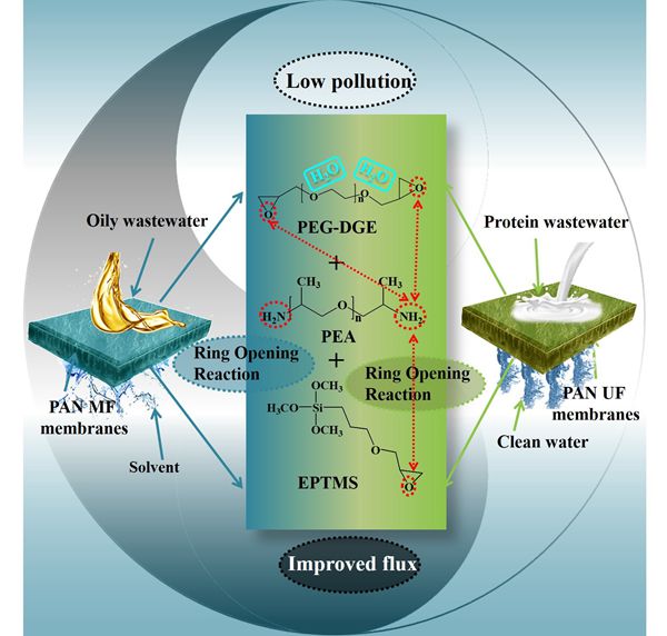 研究团队采用聚醚胺、聚乙二醇缩水甘油醚和γ-(2.3环氧丙氧)丙基三甲氧基硅烷作为活性添加剂,采用一步相转化法构筑了超亲水聚丙烯腈超滤/微滤膜。活性添加剂在特定条件下发生开环反应形成的新型亲水交联网络(Gel-PP/Gel-PPG),在膜表面与膜孔内部引入大量亲水官能团(-CH2-O-CH2-、-COOH、-Si-OH),赋予分离膜优异的水合能力,同时实现聚丙烯腈微滤孔径的精细调节。改性后聚丙烯腈膜孔径变小,对正辛烷乳液的去除效率高达99.8%。同时该种膜的乳液分离渗透性能提升30%,达到2164 L·m-2·h-1·bar-1,通量恢复率高达88%以上,展现出优异的耐污染性能,相关研究成果发表在膜分离领域顶级期刊《Journal of Membrane Science》上。