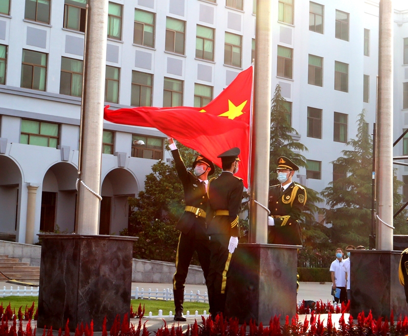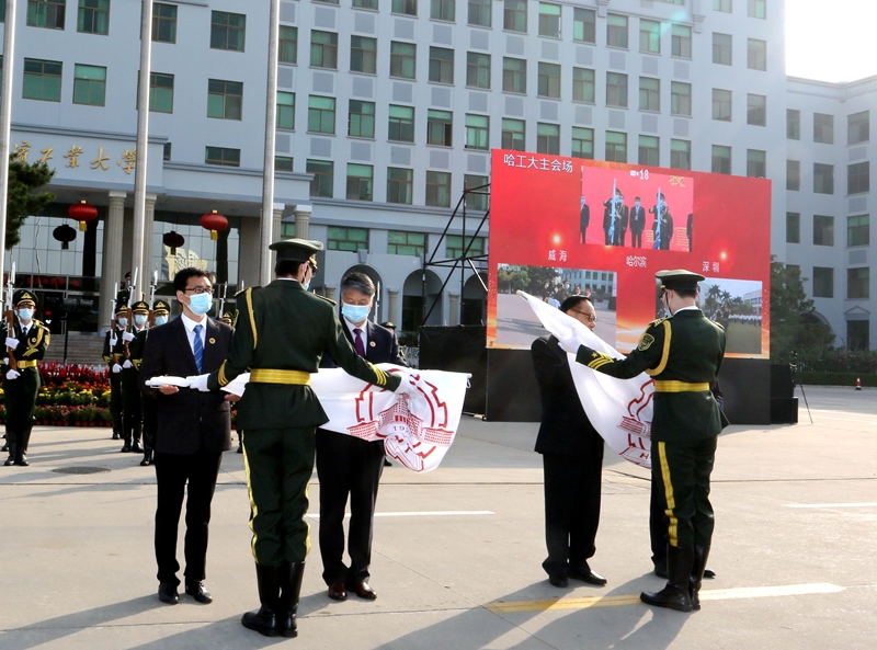 6时45分,哈工大副校长、哈工大(威海)校长徐晓飞,威海校区领导姜波、钟诗胜、曲世友、赵国亮、张文丛,党委委员赵常信、张颖、周志权、马海鹰、黄美香,各院、部、处、办直属单位正职领导以及学生代表100人,在主楼广场集会,参加一校三区主题升旗仪式。