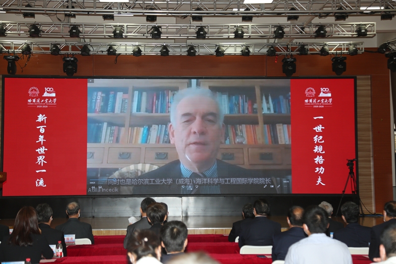山东省委、省政府,威海市委、市政府专程发来贺信,海洋科学与工程国际学院院长、英国思克莱德大学副校长阿提拉·因塞斯克教授发来视频表示祝贺。哈尔滨主会场环节结束后,威海校区副校长钟诗胜宣读贺信。