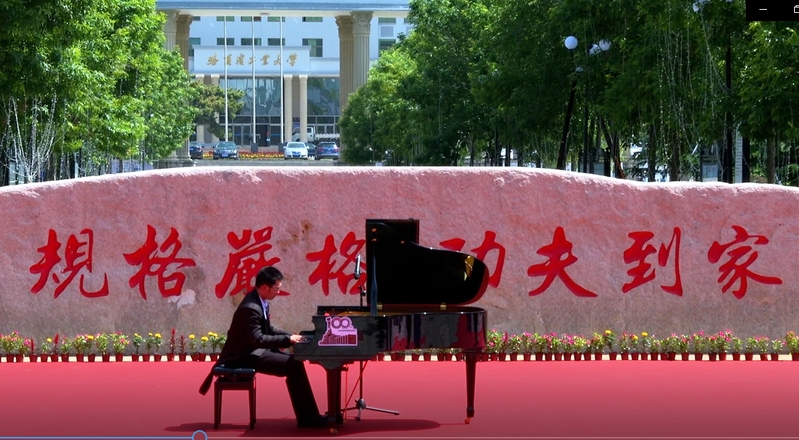 在威海特有的蓝天白云下,在校区的校训石前,伴随着悠扬的节奏,由学生代表田雨禾、张家源演唱的《威海之恋》唱响了师生和校友们最美好的青春旋律。李承浩同学表演的钢琴独奏《我的祖国》脉脉温情中展现了当代大学生的家国情怀以及意气风发、青春飞扬的蓬勃朝气。威海校区教工合唱团带来的合唱《共和国之恋》,流动的旋律中流淌着哈工大人的炽热情感,起伏的节奏中述说着哈工大全体成员的爱国心声,表露着一校三区的哈工大人筚路蓝缕,在新的历史起点上不忘初心、继续前行的笃定信念和美好愿景。