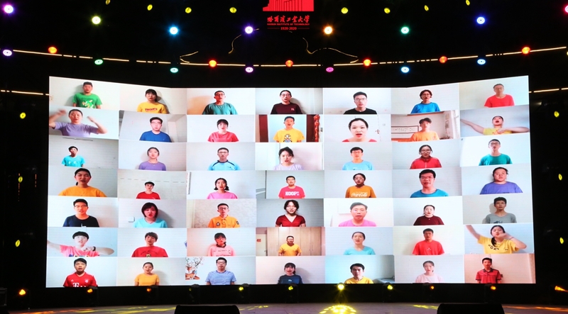 结束曲《我们都是追梦人》由学生合唱团的40多名学生演唱,是当晚参与人数最多的一个节目。云端演唱,不仅考验唱功,更是考验视频录制的技术。自5月初接到演唱任务,校学生合唱团所有团员热情高涨,积极复习歌曲和动作。合唱团临时成立视频工作组,从头开始学习视频录制和剪辑技术。4天之内近50位同学完成了近、中、远三个视频机位的录制;视频组对近150份视频逐一剪辑,调整速度,统一动作和节奏。面对巨大的任务量,工大学子没有被吓倒,反而斗志昂扬,团结一致。大家白天上课,晚上研究,常常干到凌晨;没有专业设备,同学们就下功夫一帧一帧调整;碰到技术难题,就一边学习一边干;在时海珍老师的指导和大家的共同努力下,视频终于以近乎完美的效果在 6月7日晚与大家见面。合唱团的同学们说:“短短四分多钟的视频里,凝聚了老师和全团同学近一个月的心血,它早已不只是一个单纯意义的视频,更是我们哈工大学子不惧困难,用实际行动践行校训‘规格严格,功夫到家’的真实写照。这是我们校学生合唱团用真心为工大百年校庆献上的一份特殊礼物!”