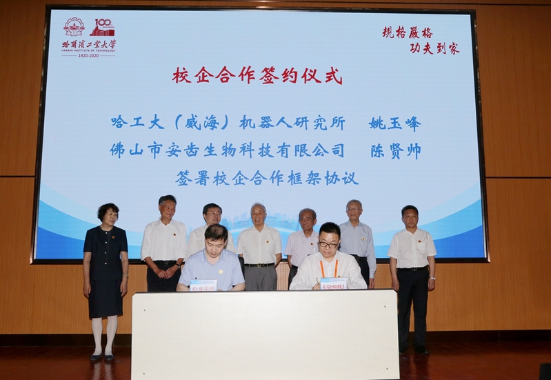 哈工大(威海)机器人研究所姚玉峰与佛山市安齿生物科技有限公司总经理陈贤帅代表双方签署校企合作框架协议