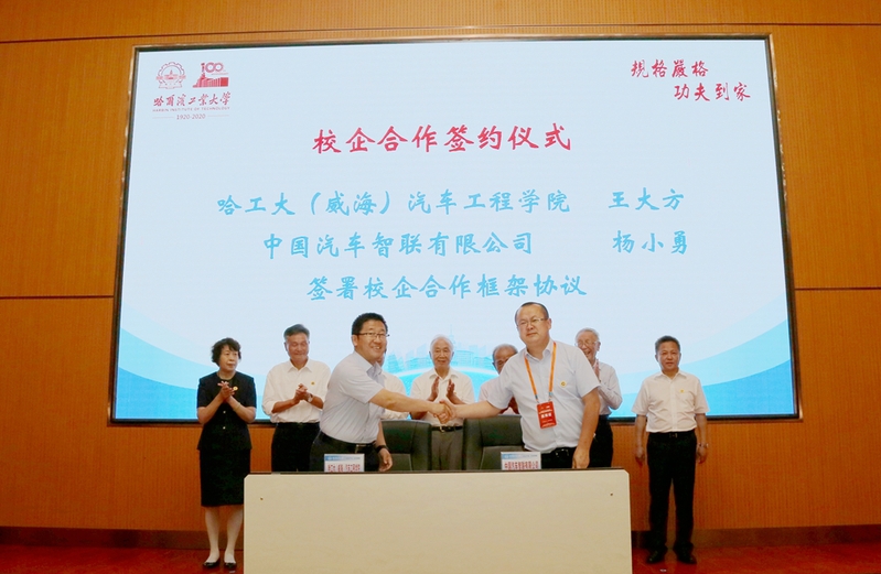 哈工大(威海)汽车工程学院院长王大方与中国汽车智联有限公司总经理杨小勇代表双方签署校企合作框架协议