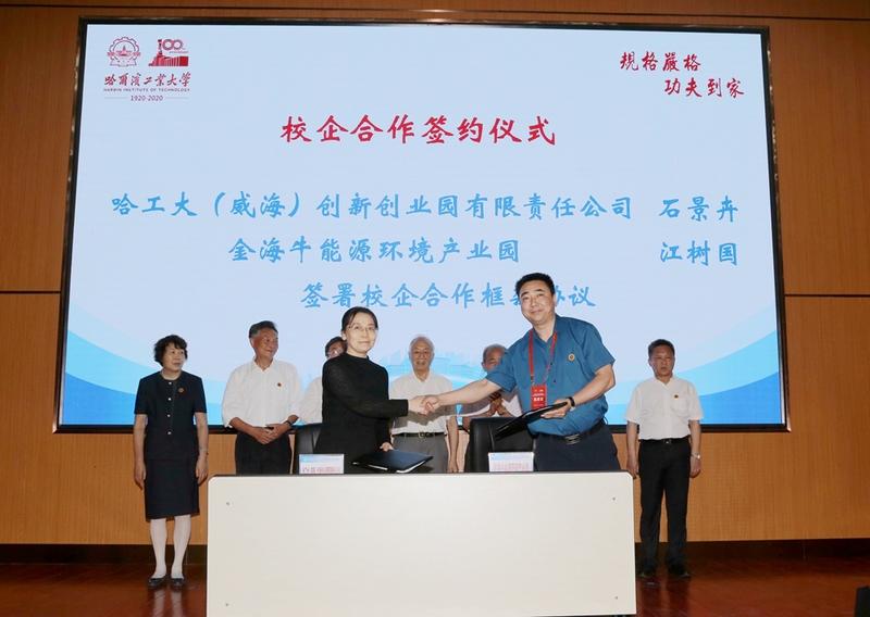 哈工大(威海)创新创业园有限责任公司副总经理石景卉与金海牛能源环境产业园董事长江树国代表双方签署校企合作框架协议