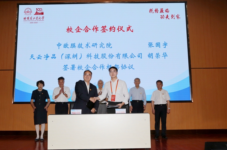 中欧膜技术研究院院长张国宇与天云净品(深圳)科技股份有限公司董事长胡荣华代表双方签署校企合作框架协议