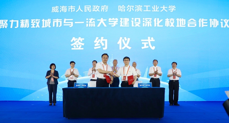 6月14日上午,在纪念哈尔滨工业大学建校100周年暨2020中国威海·国际创新创业大会上,威海市政府与哈尔滨工业大学签订《聚力精致城市与一流大学建设深化校地合作协议》,通过开展全方位、深层次、多领域的合作,构建新型“大学+城市”协作机制和合作体系,打造面向未来可持续发展的校地联合协同发展共同体。哈工大常务副校长、中国科学院院士韩杰才,威海市委副书记、代市长闫剑波分别代表双方签约。山东省副省长、中国工程院院士凌文,哈工大原校长杨士勤,威海市委书记张海波,中国工程院院士、威海人才协会会长杜善义,山东省委组织部副部长龚文东,哈工大副校长、威海校区校长徐晓飞,山东省人社厅副厅长周春艳共同见证签约。