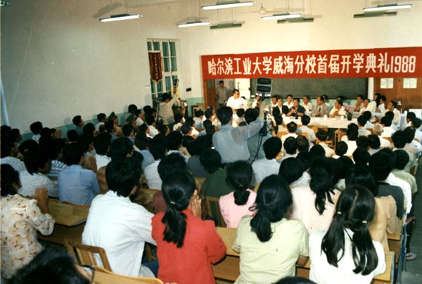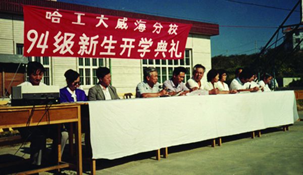 哈工大威海分校隆重举行揭牌仪式和首批学生开学典礼。威海市委书记李太启、市长李文全、哈工大杨士勤校长、党委副书记强金龙、副校长兼威海分校校长强文义等参加揭牌仪式和开学典礼。航天工业部教育司院校处处长陈达明宣读航天工业部贺信。杨士勤和李文全为哈工大威海分校揭牌,李太启和杨士勤分别发表讲话,强文义做工作报告。典礼由威海分校党委书记金光主持。