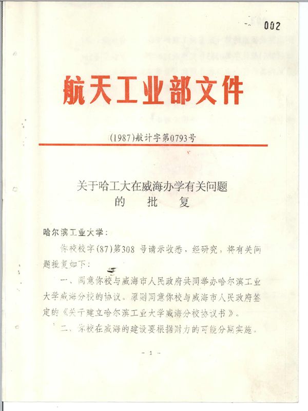 航天工业部(1987)航计字第0793号文批复,同意哈尔滨工业大学和威海市人民政府签订的创办哈工大威海分校的协议。