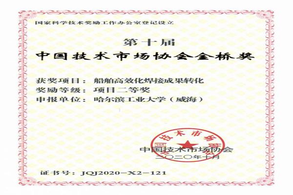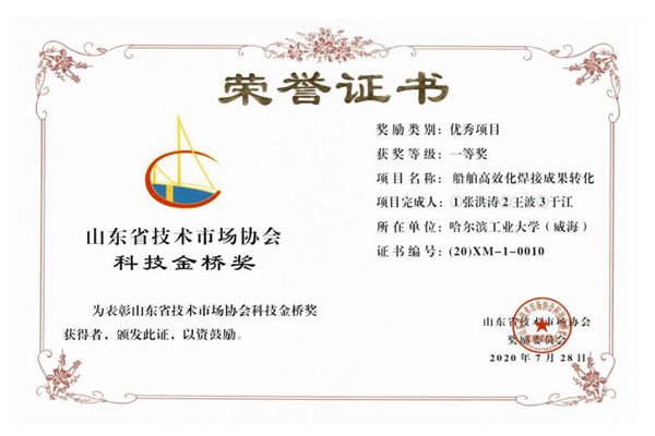 近日,2020年度山东省技术市场科技金桥奖评审工作结束,经过层层评审和选拔,我校区材料学院张洪涛团队近年来开展的船舶高效焊接技术成果转化项目获得山东省技术市场协会科技金桥奖一等奖。同时,该项目被推送至中国技术市场协会参加中国金桥奖项目评审,最终获得国家金桥奖优秀项目二等奖。