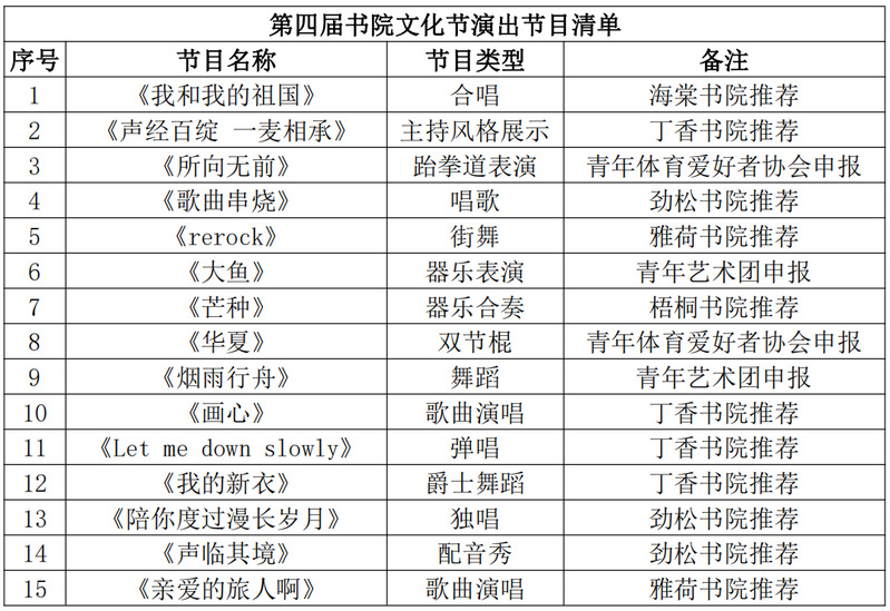 主要内容:集中展示一年来各书院在社团建设、通识课教育、书院故事、书院文化成果。附件为书院文化节开幕式节目清单。