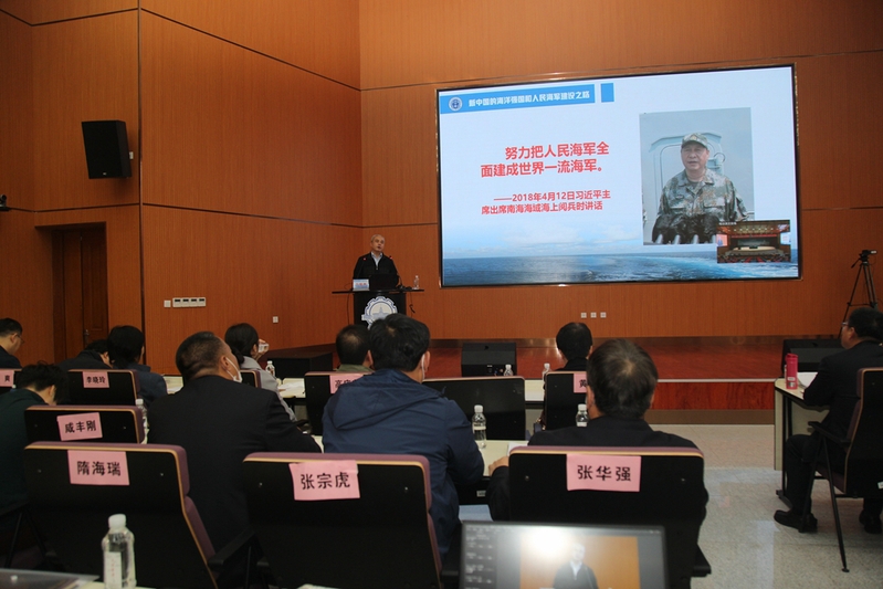 在威海校区会场,海军航空大学原教授、央视《百家讲坛》主讲嘉宾、校区教授马骏杰以《新中国的海洋强国和人民海军建设之路》为题做了专题报告。马教授首先从海洋强国的内涵出发,结合史料介绍了中国明朝时期建设海洋强国的实践历程和新中国建设“海洋铁路”和“海上长城”的构想。马教授提出,建设海洋强国是中华民族历史发展的必然选择,新时代必将实现海洋强国之梦。