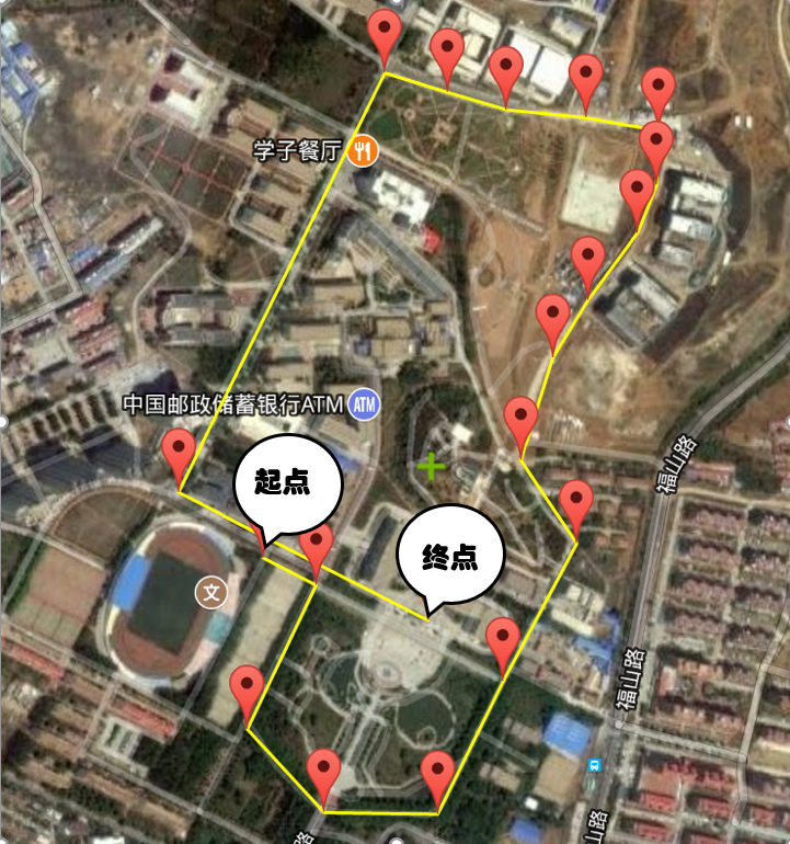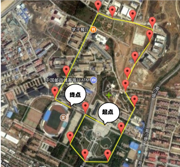 路线:起点为主楼广场,向西沿着日月湖外围湖西路、湖东路环绕一圈(途径校训石),之后经过留学生餐厅、希望路、十二公寓、综合球类馆、大学生活动中心、学子步行街、明学楼(M楼),跑到工学楼(G楼)后再沿着日月湖外围环绕一圈,经过上述建筑后从工学楼门前直接穿过马拉松大门,全程约6.5公里,具体路线图后附后。
