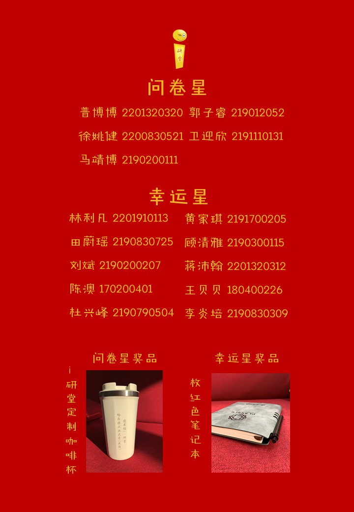 奖品:问卷星奖励i研堂定制咖啡杯1个,幸运星奖励软皮笔记本1个。