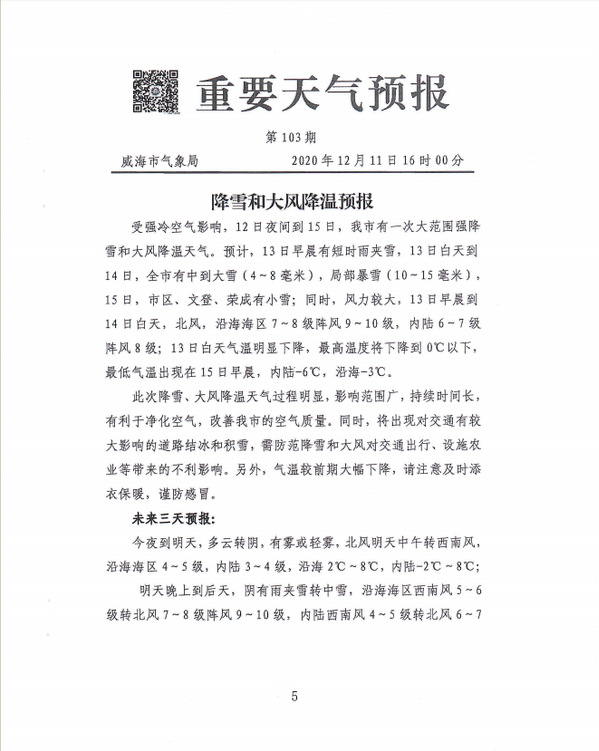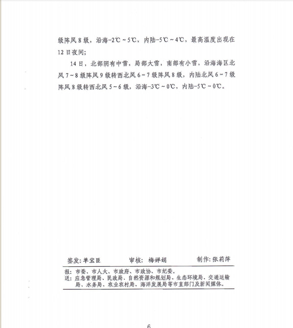 接威海市人民政府通知,据市气象局预报,受强冷空气影响,自12月12日起到15日夜间,我市有一次大范围强降雪和大风降温天气,预计13日白天到14日,全市有中到大雪(4~8毫米),局部暴雪(10~15毫米);同时,风力较大,13日早晨到14日白天,北风,沿海海区7~8级阵风9~10级,内陆6~7级阵风8级;13日白天气温明显下降,最高温度将下降到0℃以下,最低气温出现在15日早晨,内陆-6℃,沿海-3℃。