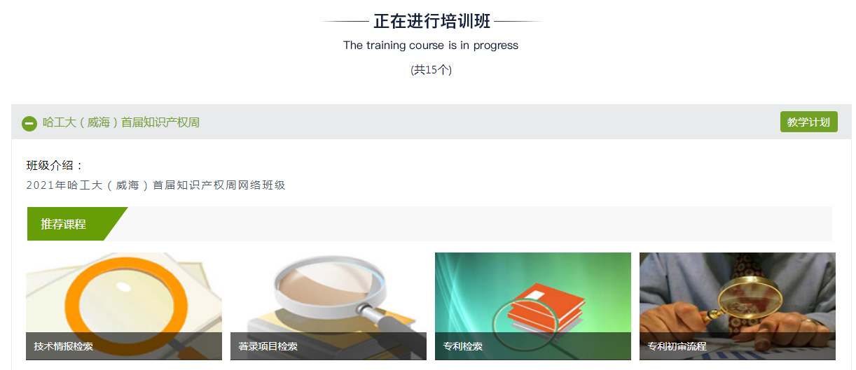 4.登录后,下拉页面,在“正在进行培训班”中,展开哈工大(威海)首届知识产权周