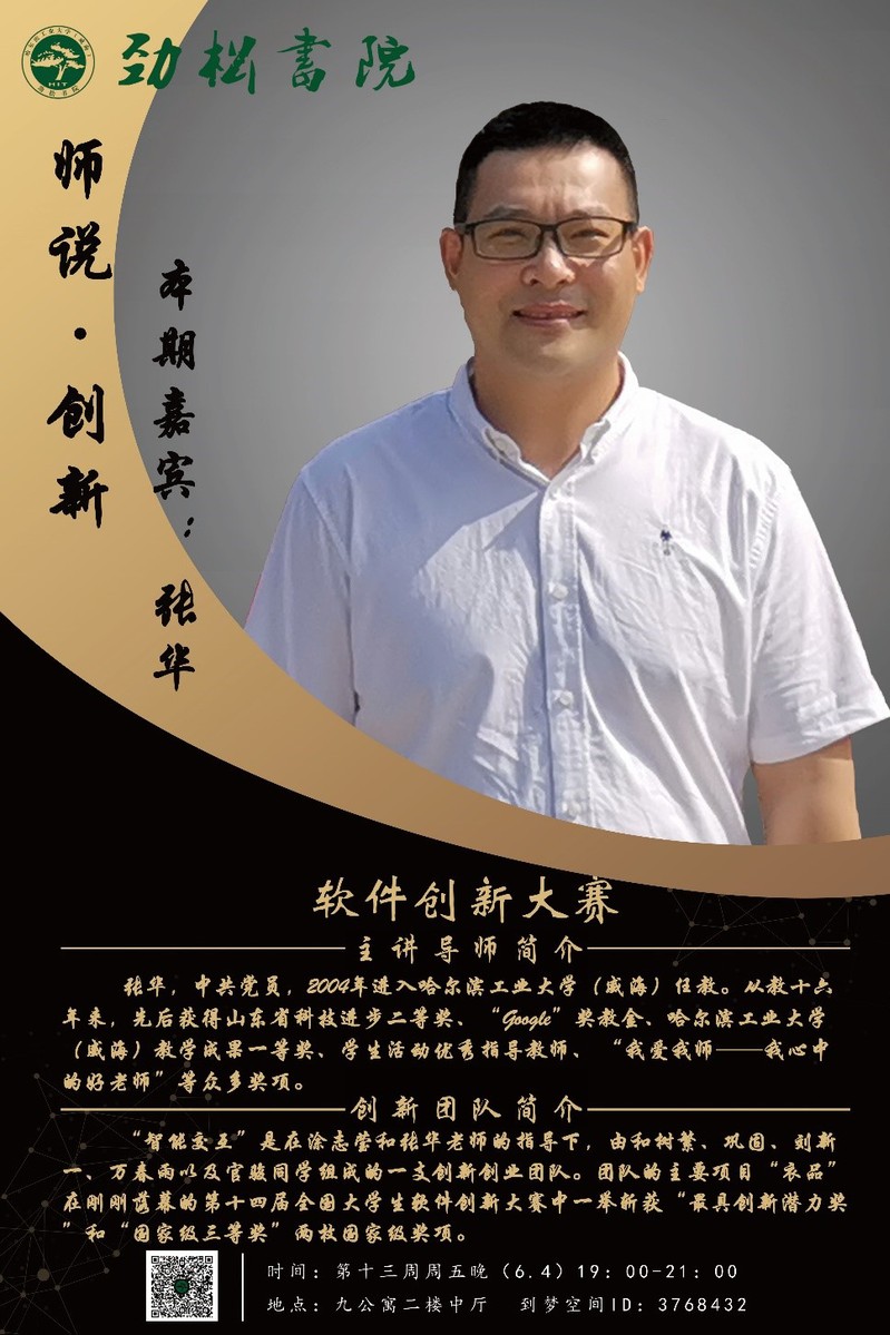 为了让同学们更好地了解软件创新大赛,劲松书院将于第十三周周五(6.4)19:00-21:00在九公寓二楼中厅举办第四期“师说·创新”活动,本次活动的主讲嘉宾是计算机科学与技术学院的张华老师。