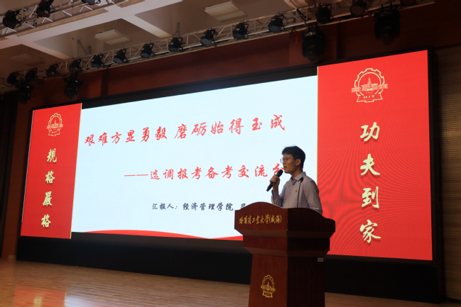 观看宣传片后,威海校区2021届四名优秀选调生代表余同学、吕同学、刘同学、曹同学进行了交流分享。四位同学依次以选调生的大学成长历程、各省考情、报考备考、综合考察为主题展开了分享: