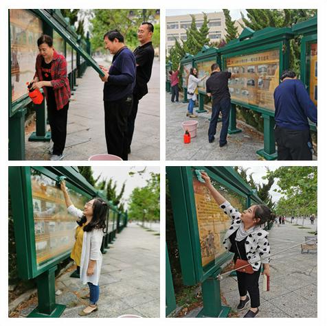 下午,志愿者们带着提前准备好的劳动工具,早早来到学子餐厅南侧的文化长廊。大家提壶喷水,手持抹布,用心地擦洗着每一块展板,用双手将长廊的每一个角落打扫得干干净净。大家热情高涨,欢声笑语中,以别样的方式表达着自己对学校的热爱。