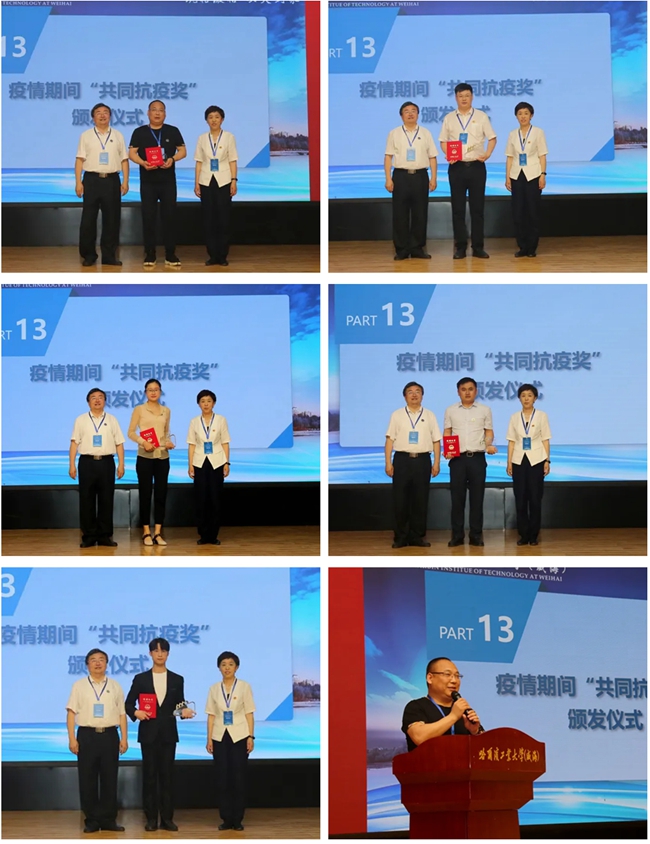 疫情期间,广大校友及企业积极支持学校抗击疫情,为受疫情影响的学弟学妹们提供援助,为师生生命健康和安全助力。徐晓飞和张淑娣为疫情期间对校区做出突出贡献的团体和个人代表百福泰(青岛)防护科技有限公司总经理宋再军、青岛威巴克消毒技术有限公司董事长李川、山东恒达知识产权股份有限公司总经理张琦、山东利泽信息科技股份有限公司总经理李伟利、校友李哲瀚颁奖。