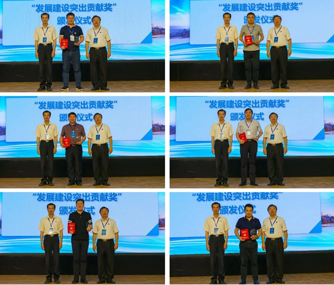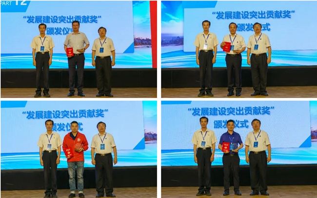 才巨金和徐晓飞为获奖代表威海建设集团股份有限公司总经理林宁、威海光威复合材料股份有限公司董事长卢钊钧、宋森华校友、北京中农信达信息技术有限公司副总裁王建林、河北亿利橡塑集团有限公司刘海涛、任子行网络技术股份有限公司总裁沈智杰、歌尔集团有限公司王晓东、山东汇金彩钢有限公司董事长高鹏文、泰安聚力铝业工贸有限公司总经理王瑞群、深圳市科比特航空科技有限公司董事长卢致辉、山东卡尔电气股份有限公司于坤等颁发“发展建设突出贡献奖”。