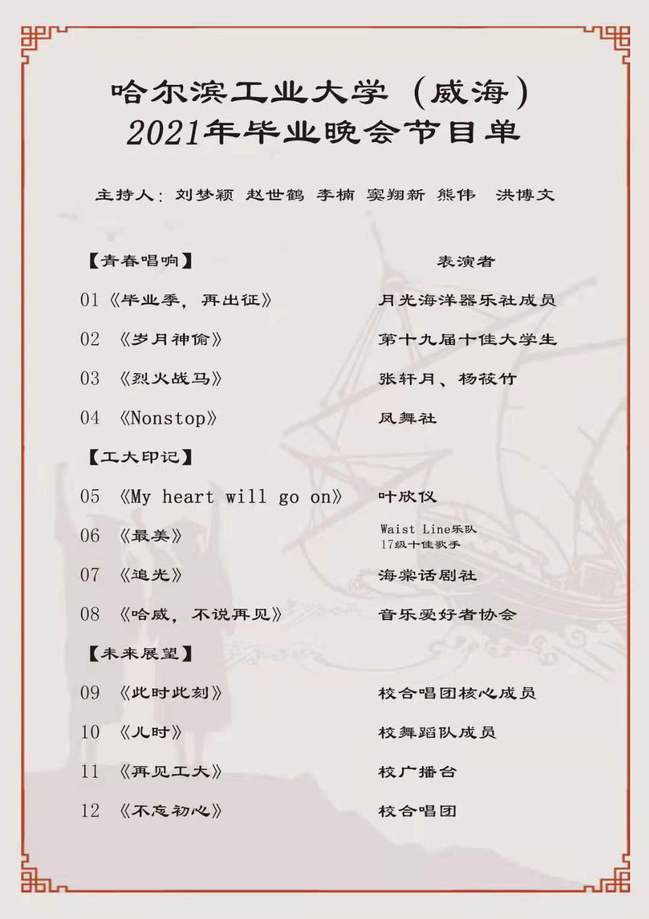 光阴似箭,日月如梭;青春远航,逐梦未来。六月的工大夏意正浓,六月的工大承载离别。为弘扬工大文化,张扬青春浪漫,哈尔滨工业大学(威海)为你我打造了释放独特个性的舞台。我们相约在日月湖畔,共同享受这场视听盛宴。2021届青春远航毕业晚会将于6月20日晚在主楼广场进行,期待您的到来!