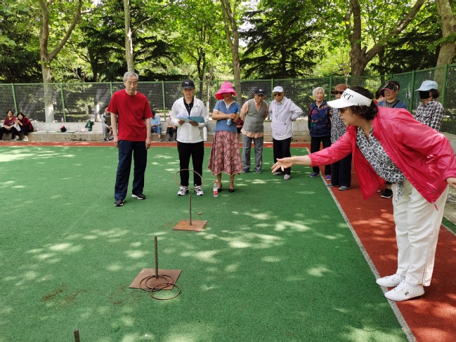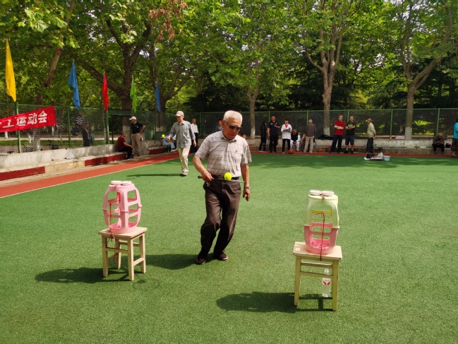 本次运动会个人项目按年龄划分代表队,男子以70岁为分界线,70岁及以上为甲组,70岁以下为乙组;女子以65岁为分界线,65岁及以上为甲组,65岁以下为乙组。离退休老同志分别参加了30米运球跑、30米拾豆跑、30米钓瓶跑、30米托球跑、2米投标中靶、2米乒乓球入筐、2米套圈、5米地滚球和门球进门等个人项目的比赛,共同参与了轻松愉快的团体项目——气排球对抗赛。门球场处处欢声笑语,老同志们热情高涨、神采飞扬,在快乐轻松的氛围中分享着运动的喜悦和精彩。经过3个小时的快乐比赛,在兴味未尽中结束。