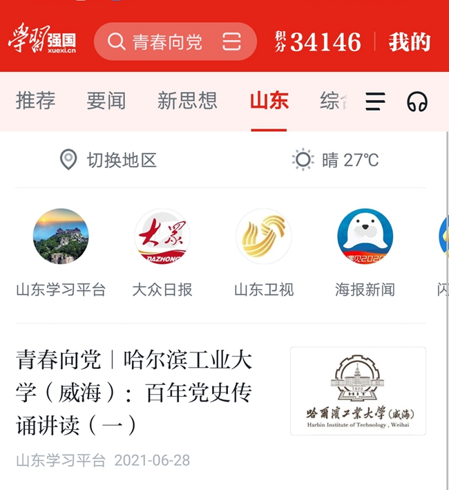 七一临近,校区精心制作的音频系列作品《百年党史 传诵讲读》在学习强国山东学习平台首页展播,丰富了党史学习教育的学习资源,展示了校区党史学习教育的特色和深度。