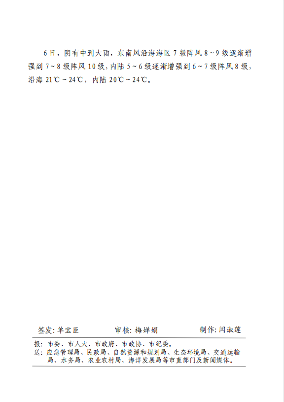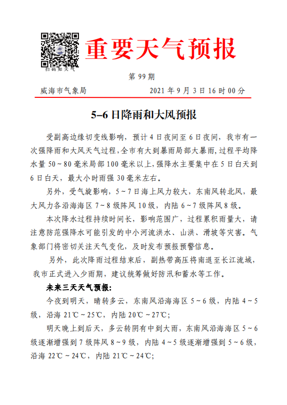 接威海市气象局通知,受副高边缘切变线影响,预计4日夜间至6日夜间,我市有一次强降雨和大风天气过程,全市有大到暴雨局部大暴雨,过程平均降水量50~80毫米局部100毫米以上,强降水主要集中在5日白天到6日白天,最大小时雨强30毫米左右。另外,受气旋影响,5~7日海上风力较大,东南风转北风,最大风力各沿海海区7~8级阵风10级,内陆6~7级阵风8级。本次降水过程持续时间长,影响范围广,过程累积雨量大,请注意防范强降水可能引发的中小河流洪水、山洪、滑坡等灾害。气象部门将密切关注天气变化,及时发布预报预警信息。另外,此次降雨过程结束后,副热带高压将南退至长江流域,我市正式进入少雨期,建议统筹做好防汛和蓄水等工作。