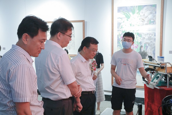开幕式上,胡韬感谢威海市青年美术家协会提供的宝贵的艺术与科技碰撞的机会,并表示我校区将会继续深化Π型育人方案,重视美育,培养更多有文化知识、有艺术修养的杰出人才。我校区学子在开幕式上展示了精彩绝伦的ROBOMASTER机器人对战,并为观展的领导嘉宾介绍了我校参展作品的设计理念、技术特色、实用价值等,当代青年对科技探索的热诚和蕴含于科技中的艺术创造力令观展嘉宾连连称赞。竹贤书院部分师生一起参加了开幕式并观展。