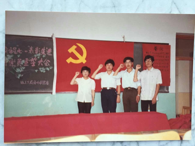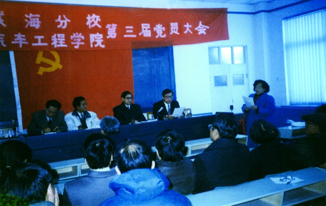 1988年9月10日,历时3年筹建的威海分校揭牌,首批学生开学。同年12月28日,威海分校召开第一次全体党员大会,参会党员只有30人。会议选举金光、马持宗、于永德、顾云飞、张颖为第一届党委委员,金光任党委书记,于永德任党委副书记。为加强党的工作,会议制定了党委议事规则,组建了教务党群、校办后勤、机械教研室、基础课教研室四个党支部,健全了基层组织党内民主生活。