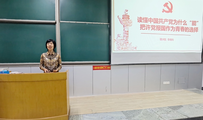 在入党启蒙教育中,李晓玲以“中国共产党为什么能?”为主题,结合中国共产党百年来的发展历程,从“有远大理想追求”“有科学理论引领”“有人民至上情怀”“有选贤任能机制”“有自我革命精神”“有强大领导能力”六个方面,以鲜活的案例和详实的数据进行了讲解。李晓玲勉励同学们不仅要读懂中国共产党为什么“能”,更要学做结合,牢记习近平总书记致哈工大建校100周年的贺信精神,树立远大理想,把许党报国作为青春的选择,在党组织的关怀和培养下,胸怀祖国,心有大我,把个人理想追求融入时代发展,把青春和奋斗融入党和人民事业,成为实现中华民族伟大复兴的先锋力量。”