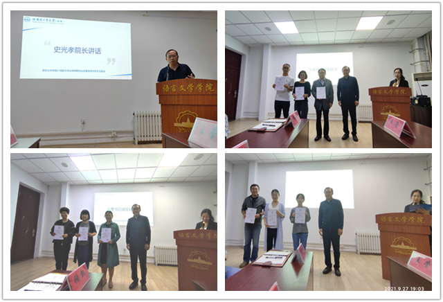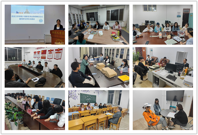9月27日晚,语言文学学院在博学楼315举行2021级新生学业导师聘任仪式暨导师见面会。参加活动的有语言文学学院院长史光孝、党总支书记张爽、英语专业学业导师苏敏、张笛、王妍俐;朝鲜语专业学业导师金鹤哲、赫美萍、单广勇;汉语言文学专业学业导师刘萱、毕慧玉、丛晓芳;辅导员张凯及2021级全体新生。仪式由语言文学学院党总支副书记王莹主持。