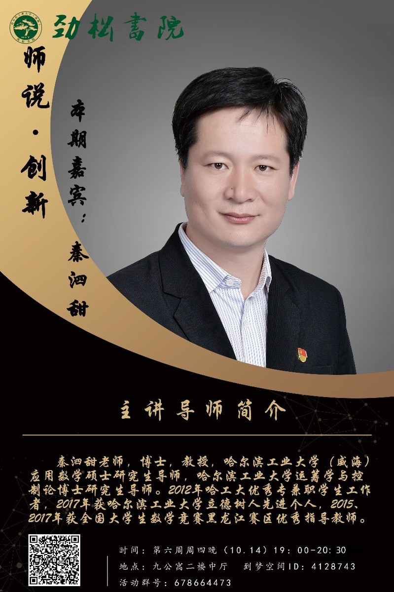 为了让同学们更好的了解到全国大学生数学竞赛,劲松书院将于第六周周五(10.14)19:00-20:30在九公寓二楼中庭举办第五期“师说·创新”活动,本次活动的主讲嘉宾是理学院的秦泗甜老师。