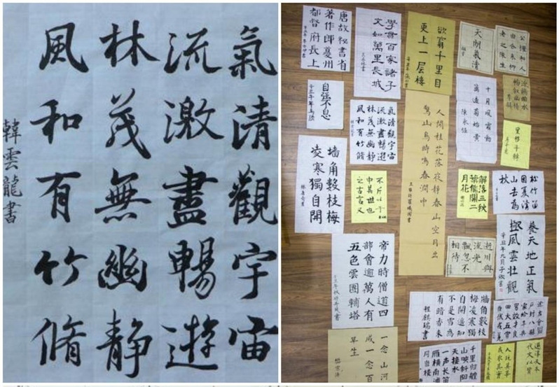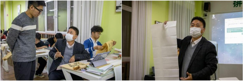 课程中不乏讨论交流与展示。胡老师与学生们各自展示自己的书法作品,相互交流讨论,不同的字体、各样的主题,借正楷的端庄缅怀先烈,以行书的流畅歌颂山河,用狂草的奔放言明志向,将篆书的古朴描述历史。胡老师在课堂上,先后展示了“楷书四大家”、“天下三大行书”、宋朝的“尚意书风”和“苏黄米蔡”四大家等书法,让同学们沉浸在汉字文化的海洋。