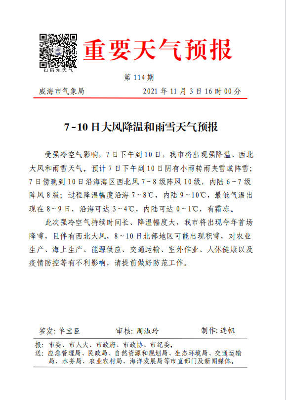 接威海市气象局通知,受强冷空气影响,7日下午到10日,我市将出现强降温、西北大风和雨雪天气。预计 7 日下午到 10 日阴有小雨转雨夹雪或阵雪;7日傍晚到10日沿海海区西北风7~8级阵风10级,内陆6~7级阵风 8 级;过程降温幅度沿海7~8℃,内陆9~10℃,最低气温出现在8~9日,沿海可达3~4℃,内陆可达0~1℃,有霜冻。此次强冷空气持续时间长、降温幅度大,我市将出现今年首场 降雪,且伴有西北大风,8~10 日北部地区可能出现积雪。