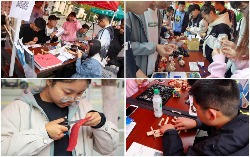 在开幕式现场,海棠书院还设计开展了“一剪钟情”、棋逢对手、鲁班锁与九连环等文化游戏活动。同学们利用书院提供的工具和材料创造出属于自己的剪纸作品;象棋、围棋、五子棋爱好者们也在切磋中重拾棋艺;鲁班锁也吸引了不少挑战者前来挑战,活动中的优胜者还获得了海棠书院为同学们准备的小奖品。