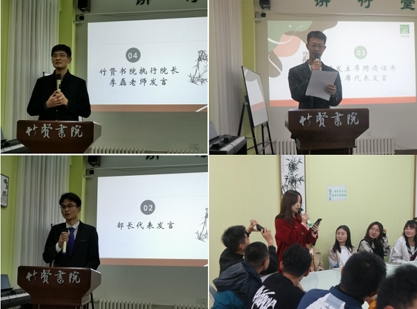 本次成立大会分为管委会成立仪式和部门交流两个环节。在成立仪式上,部长代表李根鹏、主席团代表高森梁分别结合过去一年的工作经历,从平台搭建、部门建设、活动举办等方面介绍了自己对书院文化的理解和对未来一年工作的展望。李磊代表书院欢迎新一届“竹贤人”的加入,他勉励同学们知行合一、团结协作,期望大家在做好自己工作的同时,积极为书院发展建设建言献策,把竹贤书院建设好,为校区“一站式”学生社区综合管理模式建设添砖加瓦。