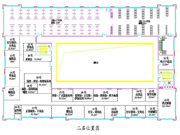 4.招租商铺基本情况:招租商铺为图中一层商铺号为2、3、4、7、10、11的商铺,二层商铺号为12-33的商铺。