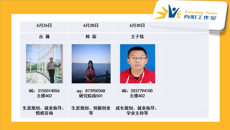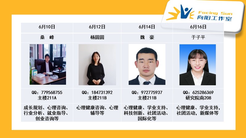向阳而生,逐光而行。“向阳成长工作室”一对一咨询6月份打卡开始了! 11位由校内老师、校外心理专家和就业指导专家组成的咨询师团队静待同学们的来访。
