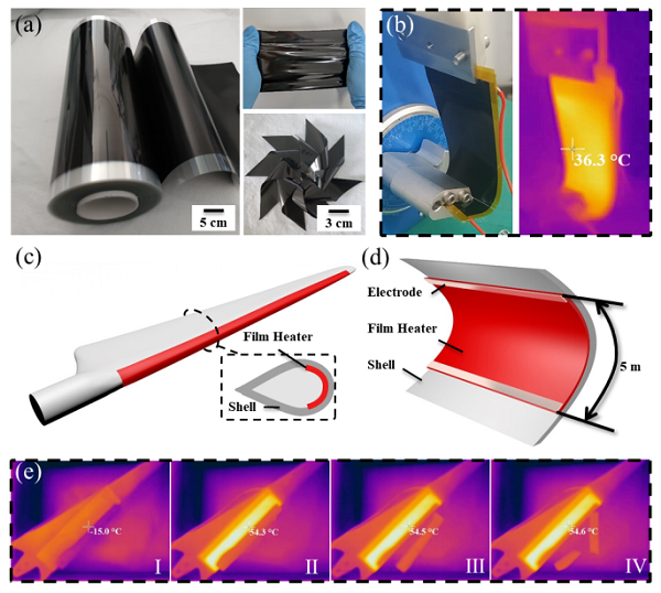 项目组攻克了碳纳米管分散的难题,采用卷对卷涂布工艺批量制备出了轻柔的碳纳米管复合薄膜,并采用热压工艺,实现了高可靠性的薄膜封装,制备的电热薄膜具有防水和抗弯折的特性。该薄膜非常轻薄、仅有头发丝的厚度,可与玻纤、碳纤等复合材料兼容,可作为加热元件置于风电叶片、飞机机翼、飞机头部等部件表层,起到除冰、防冰的作用,有效地消除安全隐患。该材料具有可弯曲/拉伸发热、发热均匀、发热迅速、发热面积大的特点,与传统方式相比,可靠性更高、能源利用效率更高、除冰更迅速。碳纳米管柔性薄膜将为各种严苛条件下的翼型界面除冰(风电叶片、飞机机翼、机头等),提供新型的原位电热模块。