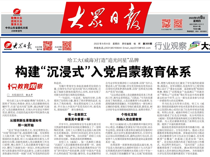 在哈工大(威海),每一名教职工都是“沉浸式”入党启蒙教育体系的重要一环。该校学院党委书记、副书记和思政课教师结合“四史”讲中国共产党的故事,回答“中国共产党是什么样的政党”的问题;辅导员、专业课教师结合专业学科发展讲哈工大的故事,回答“为什么要追求入党”的问题;学生党员和校友党员结合自身经历讲筑梦者的故事,回答“怎样成为合格共产党员”的问题。