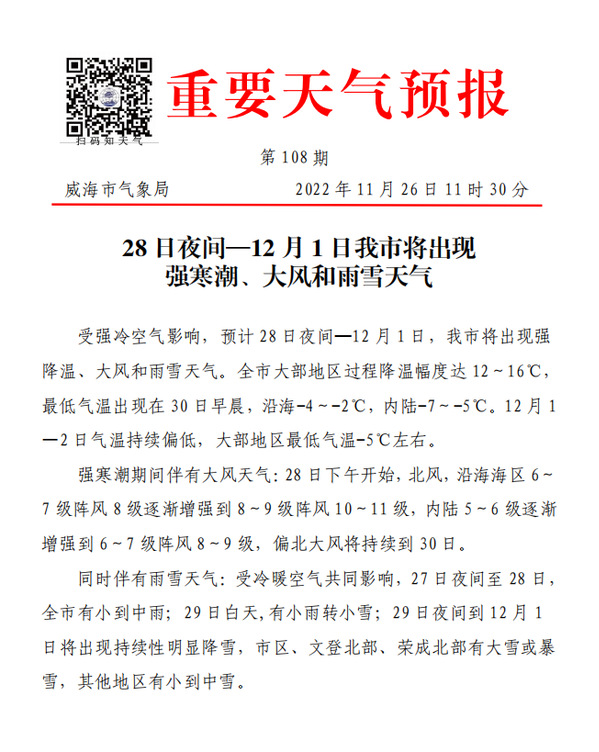 受强冷空气影响,预计28日夜间—12月1日,我市将出现强降温、大风和雨雪天气。全市大部地区过程降温幅度达 12~16℃,最低气温出现在30日早晨,沿海-4~-2℃,内陆-7~-5℃。12月1—2日气温持续偏低,大部地区最低气温-5℃左右。