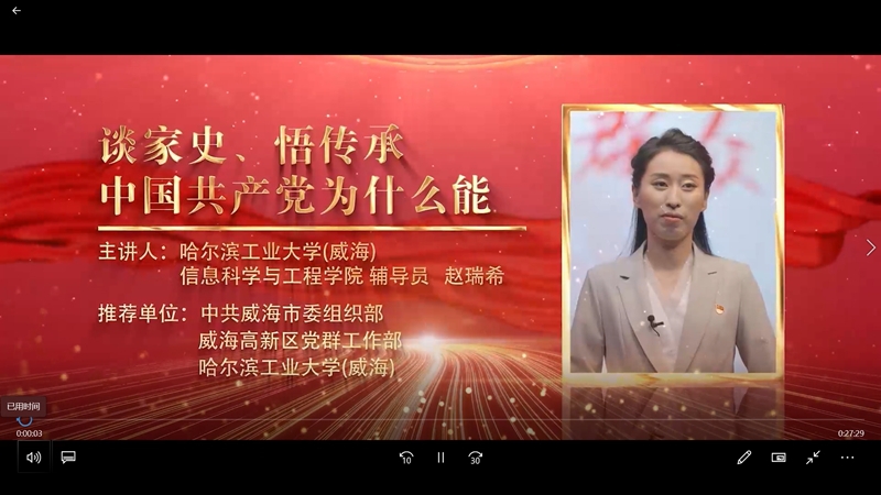 近日,2022年度全省优秀党员教育电视片(党课)观摩评比活动公布结果,校区联合威海市委组织部、高新区党工委党群工作部共同打造的两部党课作品获评山东省优秀党课。这两部作品分别为海洋工程学院院长、“中国天眼”结构系统副总工程师钱宏亮教授主讲的《天眼望星辰 丹心昭日月》,信息科学与工程学院辅导员赵瑞希主讲的《谈家史 悟传承 中国共产党为什么能》。