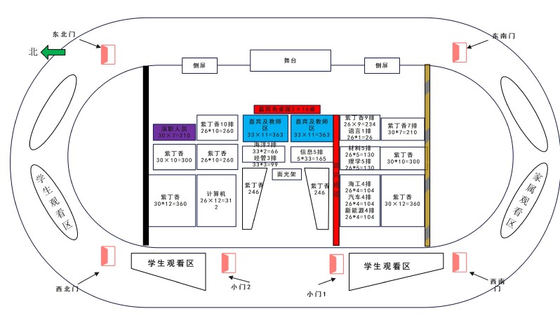 嘉宾在服务专员的引导下,从东北门(2号门)入场,在现场工作人员指引下就座。师生在18:30前在指定位置就座,请从西北门(1号门)、东北门(2号门)入场。