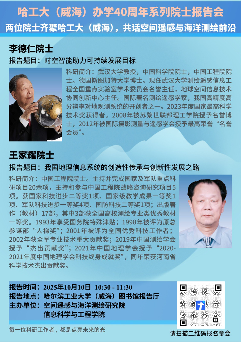 本次报告会是哈尔滨工业大学在威海办学40周年系列活动的重要组成部分,期待广大师生与院士面对面交流,拓展学术视野,激发科研热情!