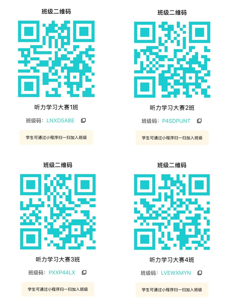 1. 学生进班:参赛学生注册并登录“听力随身练”小程序,通过小程序扫描以下班级码加入老师创建的班级,准备接收比赛任务。特别提醒:学生只需加入一个班级即可参赛。建议按首页提示授权并关注“听力随身练”公众号,以便获取比赛任务信息。