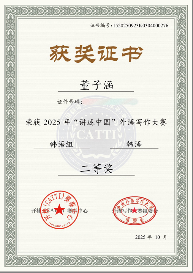 此外,在《2025年多语种阅读大赛(韩语组)》中,董子涵同学再次凭借优异的韩语阅读理解与语言运用能力,获全国三等奖。
