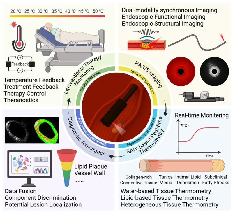 动脉粥样硬化是导致心脑血管事件的重要原因之一,易损斑块破裂可诱发急性心梗、脑卒中等严重后果。血管内光热消融治疗为斑块“精准减容”提供了新方法,但血管腔道狭窄复杂、血流与组织成分高度异质,心跳与导管微小位移会持续改变受热位置,使温度场快速变化,需要结合可靠的热监测手段。现有热电偶、光纤探头等难以准确反映局部整体温度变化,多阵元系统又难以对深层血管和斑块病灶进行有效分辨。如何在动态复杂的血管环境中实现兼顾空间分辨率、时间分辨率与临床可用性的温度监测,成为制约介入热疗发展的重要瓶颈。