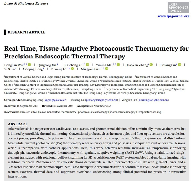 近日,校区信息科学与工程学院孙明健教授团队联合中国科学院深圳先进技术研究院和香港理工大学,在光声内窥成像与介入热疗安全监测方向取得重要进展。团队提出“基于空间自适应加权的光声内窥测温策略及系统”(PAET-SAW and PAET system),实现了介入条件下血管腔内的实时、组织自适应高精度温度监测。相关成果以《面向介入精准光热治疗的光声实时组织自适应测温方法》(Real-Time, Tissue-Adaptive Photoacoustic Thermometry for Precision Endoscopic Thermal Therapy)为题发表于光学领域顶刊《激光与光子学评论》(Laser & Photonics Reviews)。